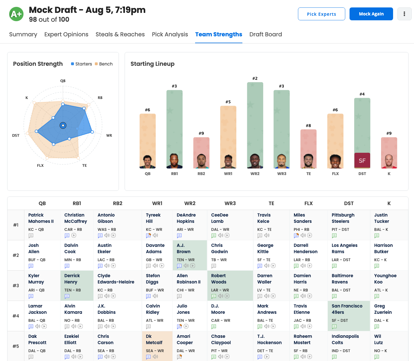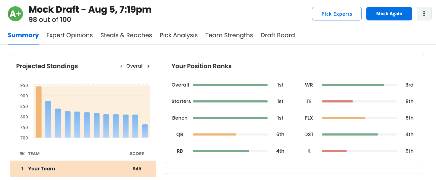 The newly designed Summary tab is the first thing you'll seen when analyzing draft results. You'll get an overview of your team's Overall score compared to that of the other teams, with breakdowns for Starters and Bench.