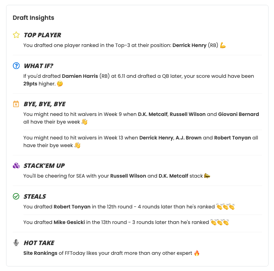 A significantly enhanced feature, the new Draft Insights will give you information on how well you did throughout your draft, with highlights for things like your top player, bye week issues, players you drafted significantly later than when they are ranked (steals), and what if scenarios (i.e. if you had drafted player X instead, you would be projected to perform better).