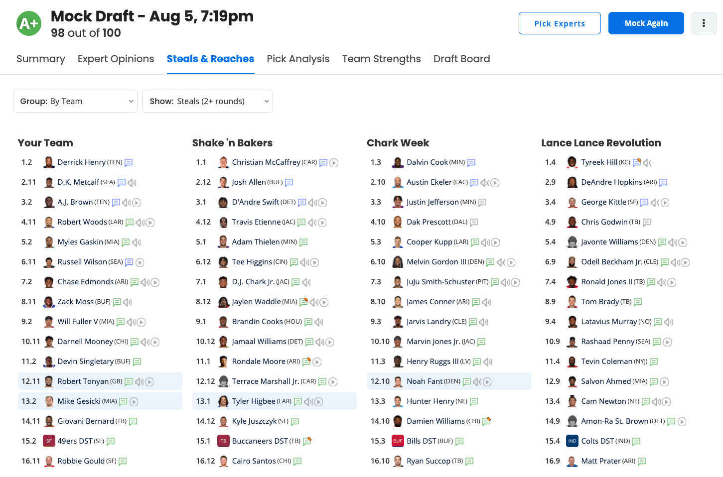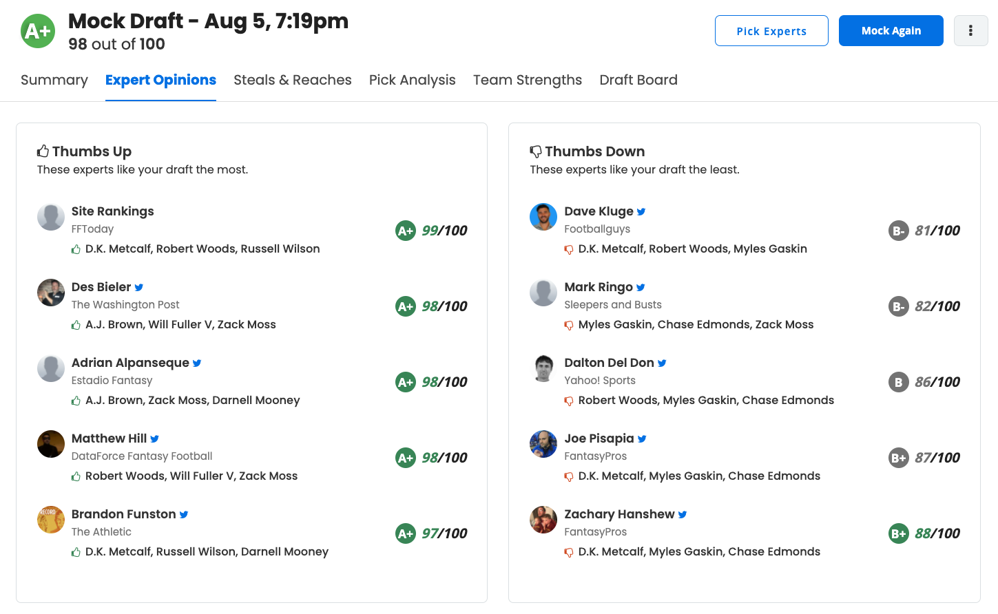 You'll see the 5 experts that like your draft results the most, along with the 5 experts who least like your results. The players that most align or differ from their rankings will also be displayed.