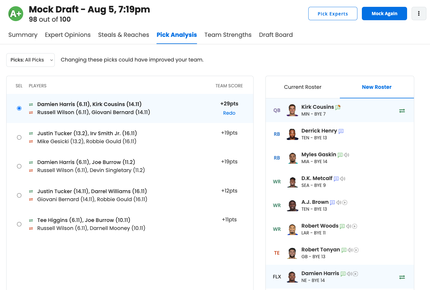 The brand new Pick Analysis tab (premium only) breaks down a variety of "what if?" scenarios: If you drafted these 2 players instead of 2 that you did select, how would your team have improved?