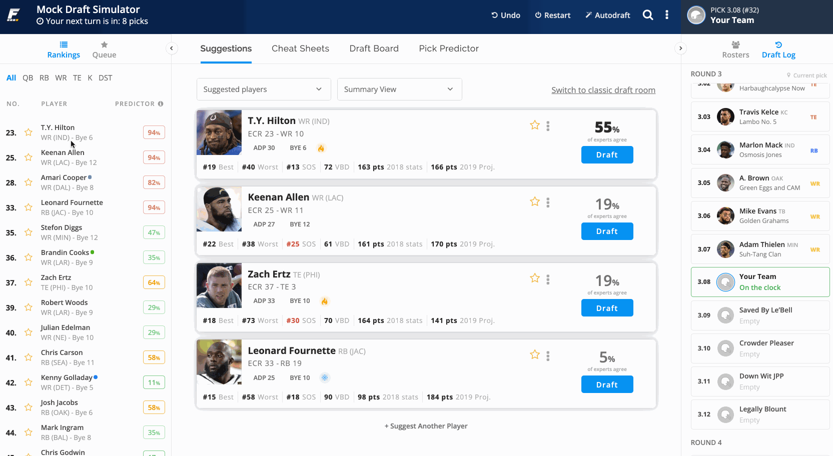 Player rankings from your cheat sheet are displayed in the left pane for quick access while looking at the variety of main views available: Suggestions, Cheat Sheets, Draft Board, and Pick Predictor.