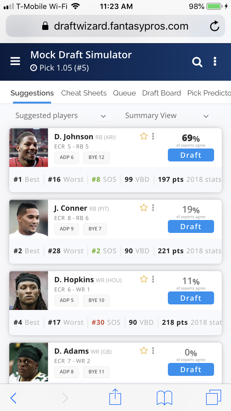 The updated Player Suggestion Queue is an enhanced version of what everyone already knows and loves. You get expert recommendations based on available players and your roster needs, with the Expert % for each player displayed on the player cards.