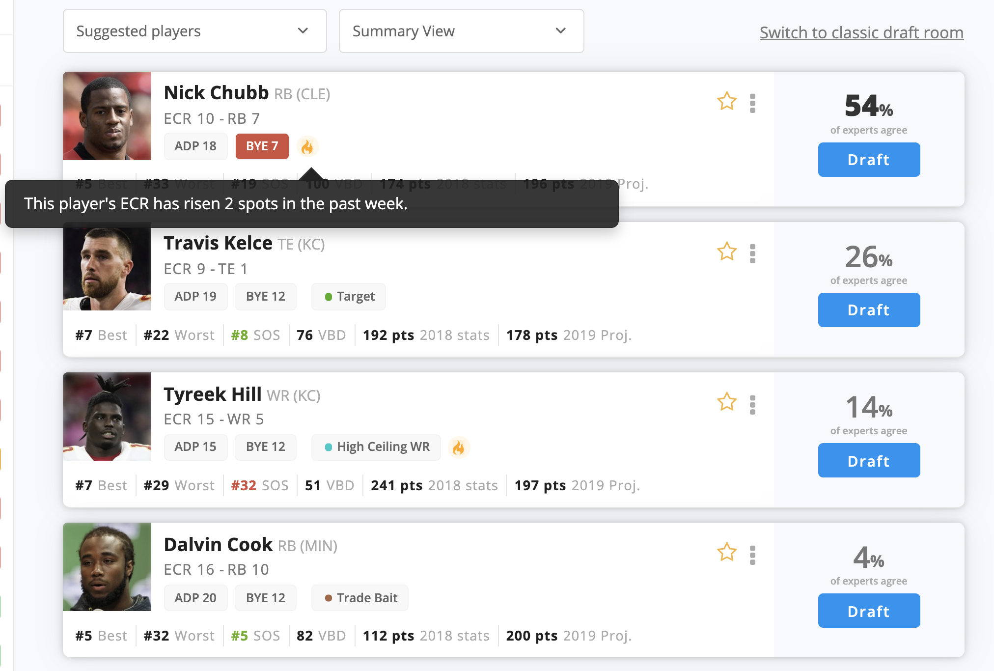 ECR risers/fallers gives you a quick way to see if a player's ECR has shifted significantly in the past week. Are they on fire (Nick Chubb?) or are the experts cooling on them (Jermaine Kearse... :( )