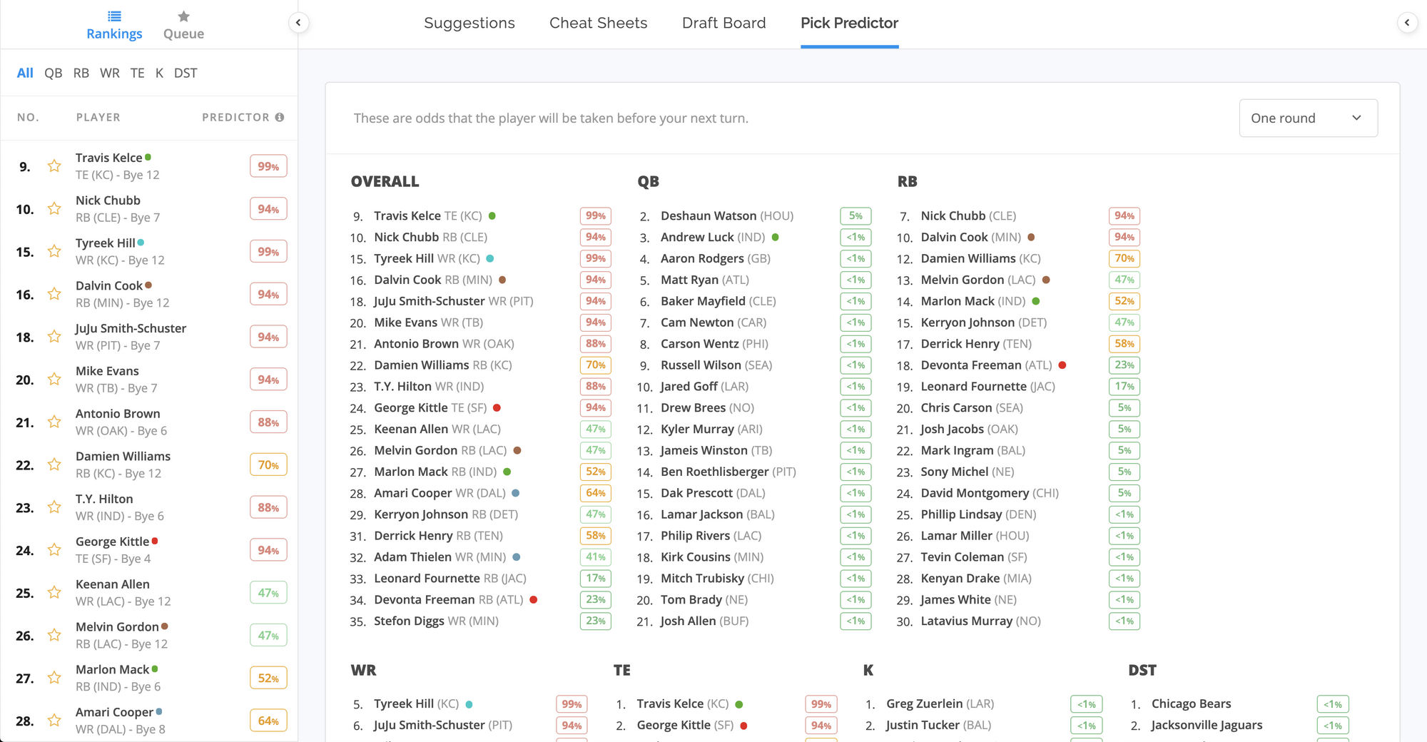 The Pick Predictor (premium only) has been added to the rankings pane on the left side. This gives you a quick shortcut to see who you can expect to be drafted in the next round, to further aid you in your decision making.