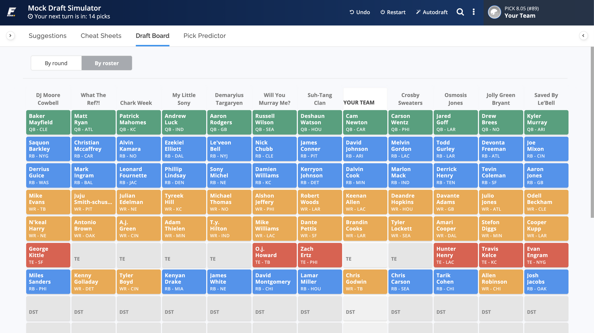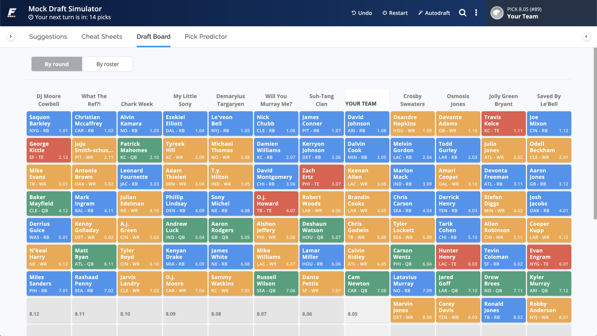 There's a toggle to switch the view between "By Round" and "By Roster". By Round is your traditional draft board. "By Roster" shows you a table to help you make decisions on if you should maybe that take extra WR because someone is waiting too long and you know they're going to be hurting (and looking for a trade).