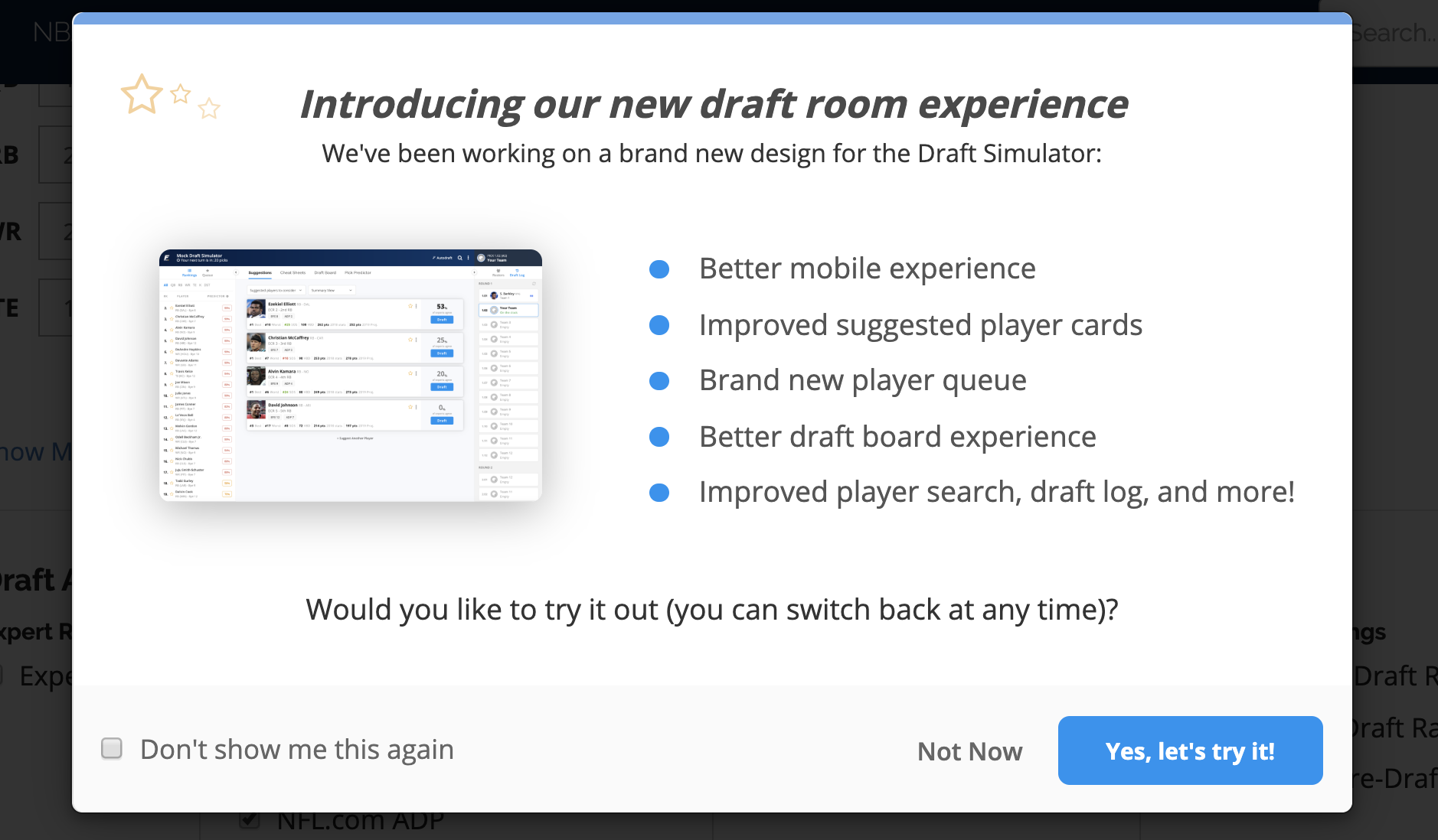 Each season, our users run tens of millions of mock draft simulations in preparation for their real drafts. The core simulation experience has largely seen smaller updates over the past few years.
