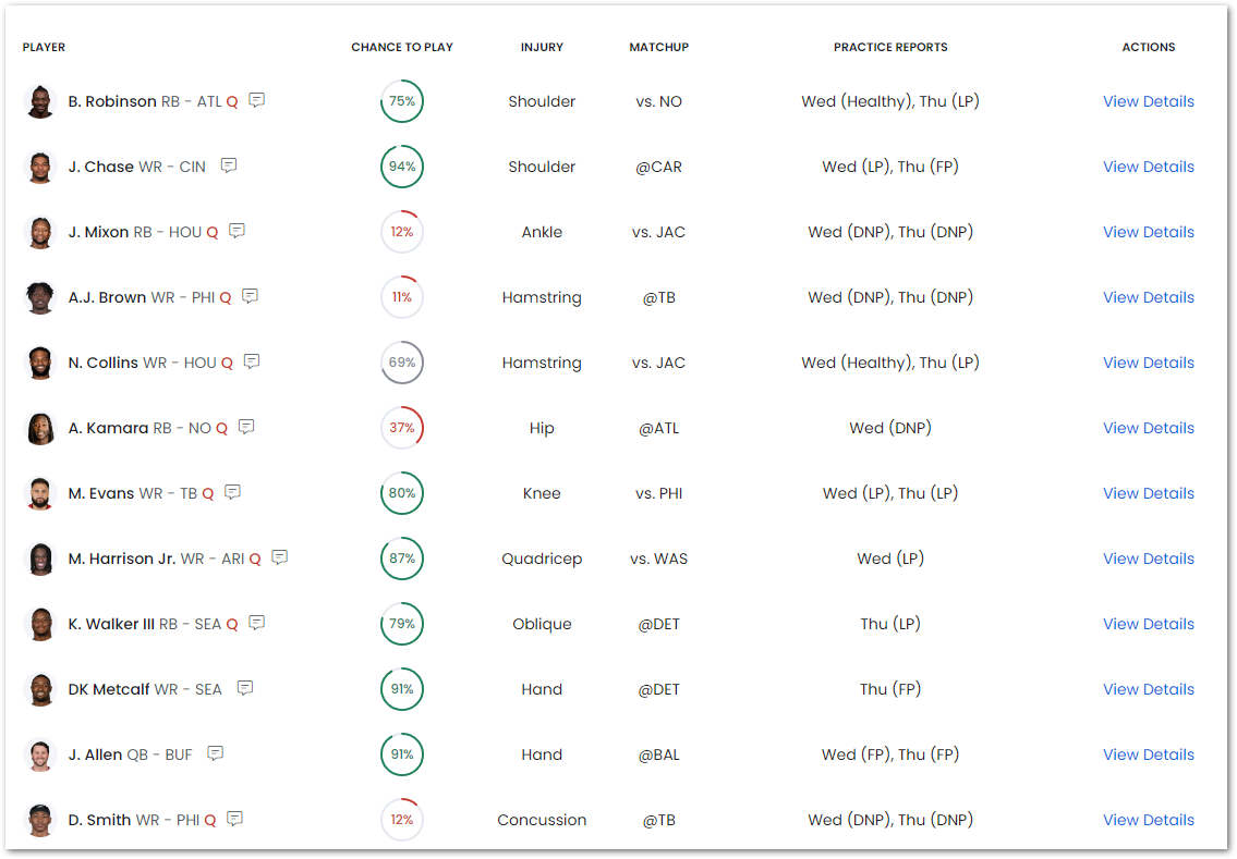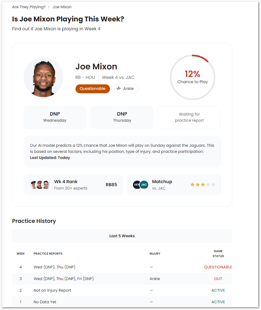 Instead of combing through practice reports, coach-speak, and Sunday morning news threads, you get a single, reliable percentage - updated throughout the week with each new practice report - that tells you whether your player is expected to play.