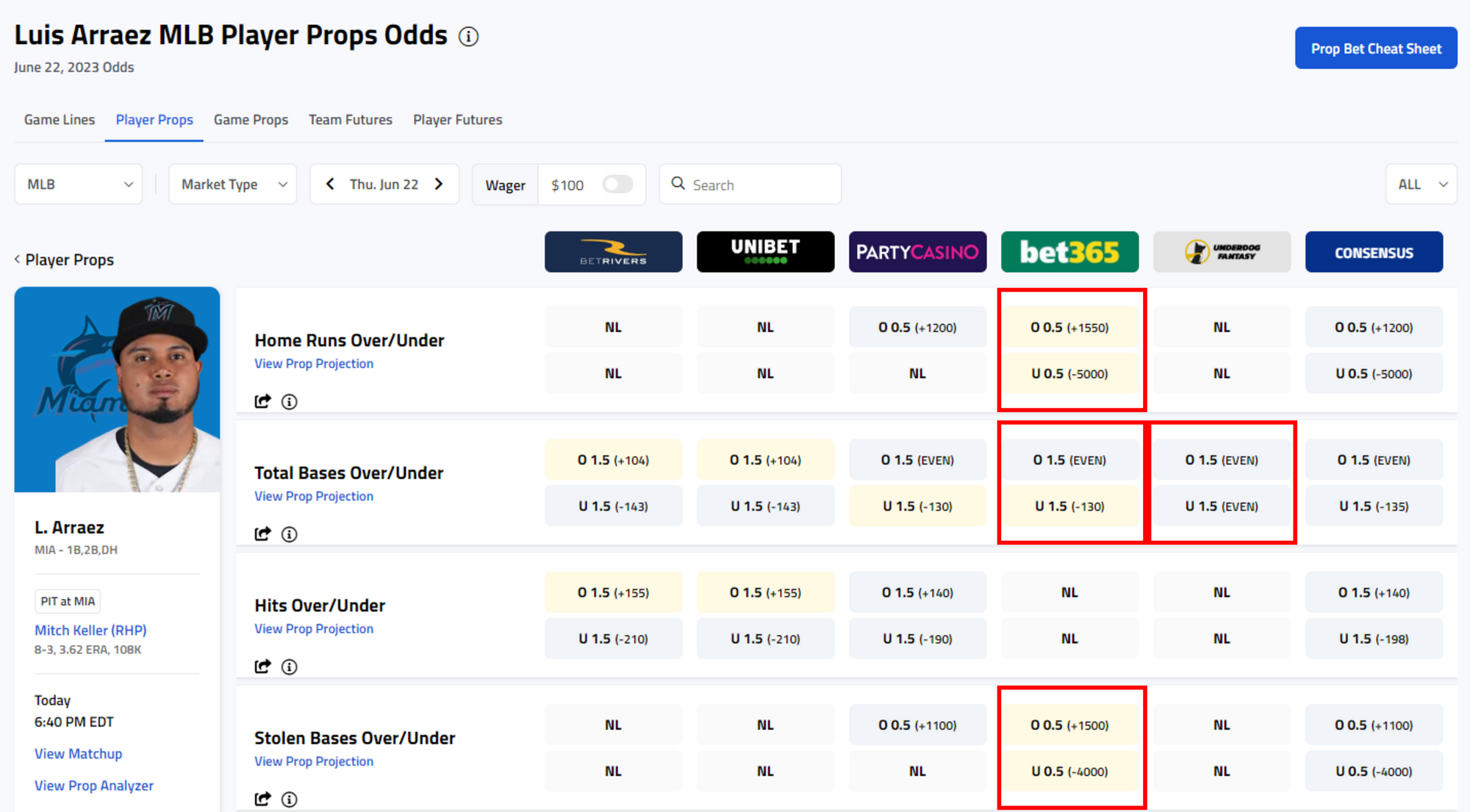 Find available odds throughout the BettingPros site and app, including on Matchup and Player Props pages.