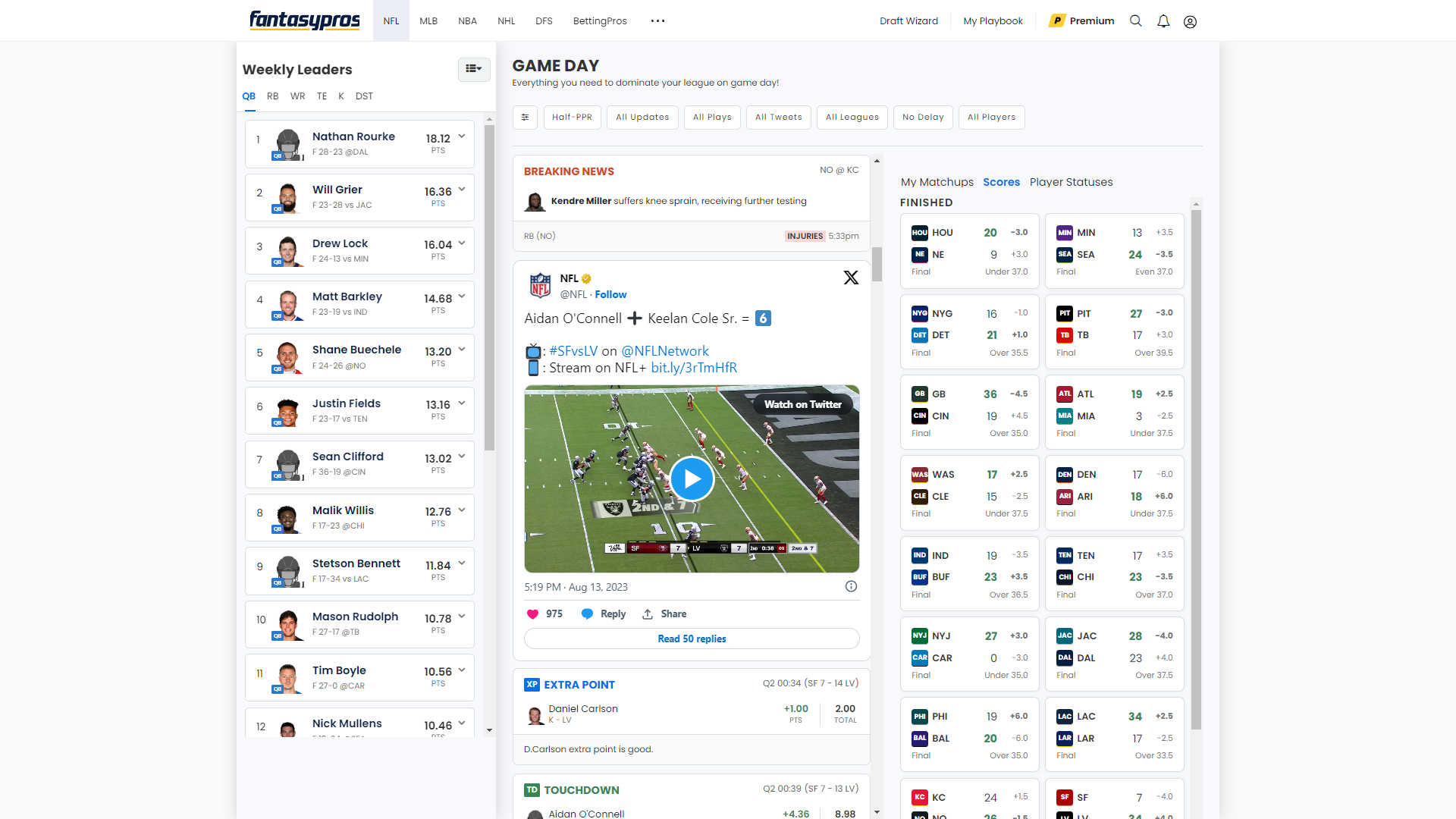 Game Day is your home for a live play-by-play feed for every game including full details of every fantasy relevant-player, and every fantasy-relevant play.