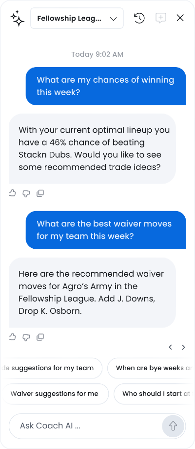 Whether you're weighing lineup decisions, considering a trade, or just looking to validate your gut instinct, Coach helps you cut through the noise and focus on what matters.