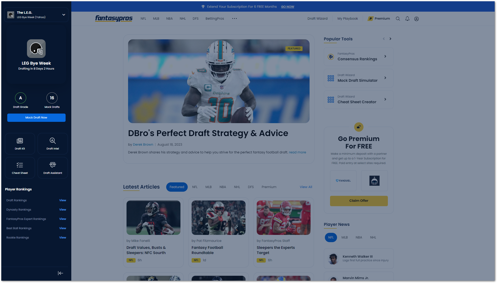 Your League Hub will stay with you throughout the site to help you put the articles, rankings, and tools you're currently using into action with your team.